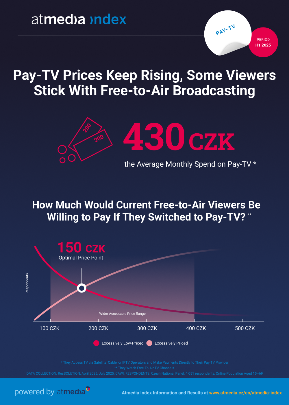 The survey research for Atmedia – sales house of thematic TV channels – was carried out by the ResSOLUTION research company using the CAWI method. The survey involved 4,051 respondents from the Czech National Panel (online population aged 15–69). The survey took place in four waves from first to second quarter of 2025 (April 3–18, 2025, July 1–13, 2025). Atmedia introduced the Atmedia Index in mid-2021. It offers TV channels, media agencies and other interested parties a comprehensive data, information and insight into two researched areas: (1) use of Pay-TV and Free-to-Air TV, and (2) use of paid video on demand (SVOD) services.