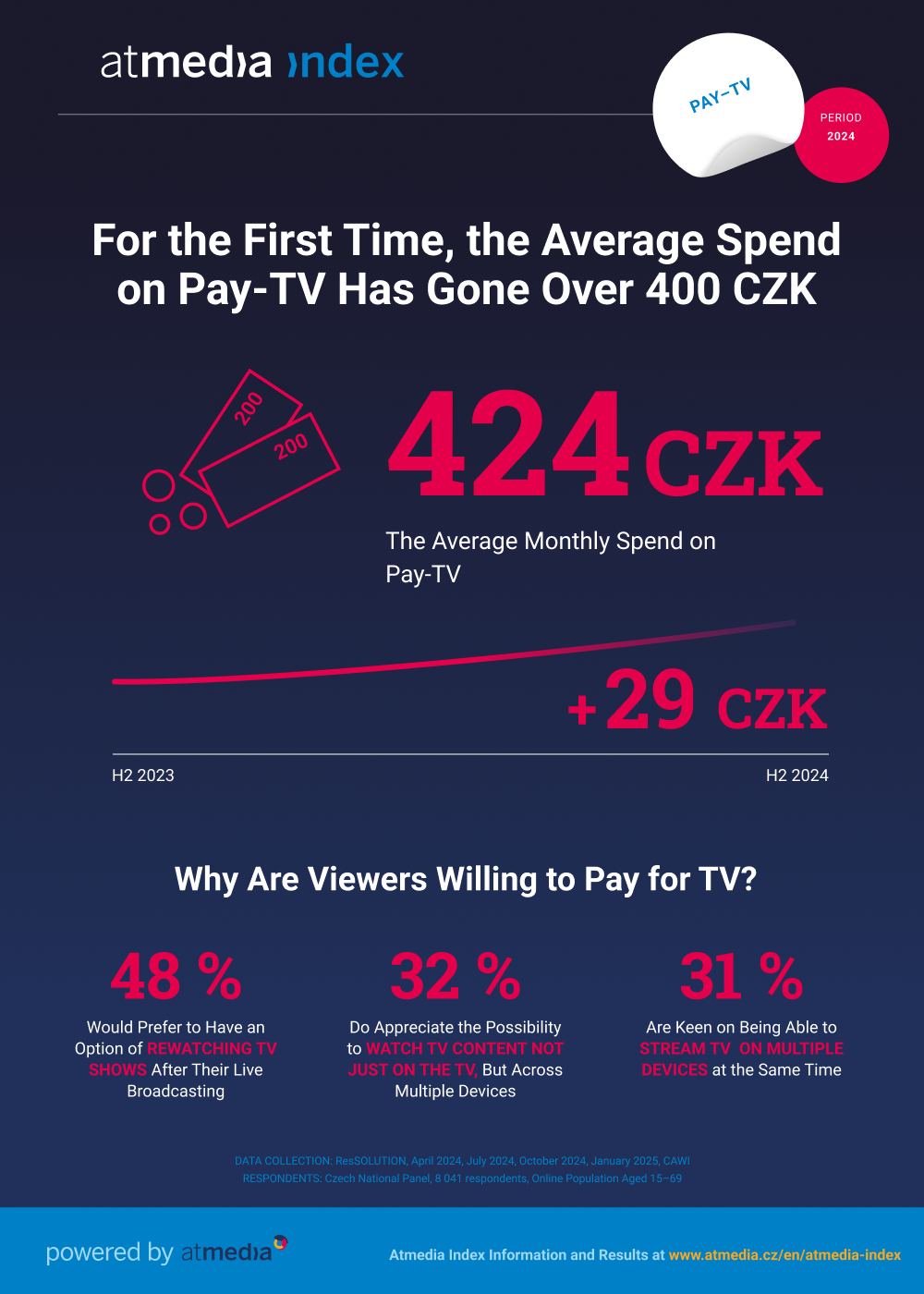 The survey research for Atmedia – sales house of thematic TV channels – was carried out by the ResSOLUTION research company using the CAWI method. The survey involved 8,041 respondents from the Czech National Panel (online population aged 15–69). The survey took place in four waves from first to fourth quarter of 2024 (April 5–22, 2024, July 3–23, 2024, October 4–23, 2024, and January 2–21, 2025). Atmedia introduced the Atmedia Index in mid-2021. It offers TV channels, media agencies and other interested parties a comprehensive data, information and insight into two researched areas: (1) use of Pay-TV and Free-to-Air TV, and (2) use of paid video on demand (SVOD) services.