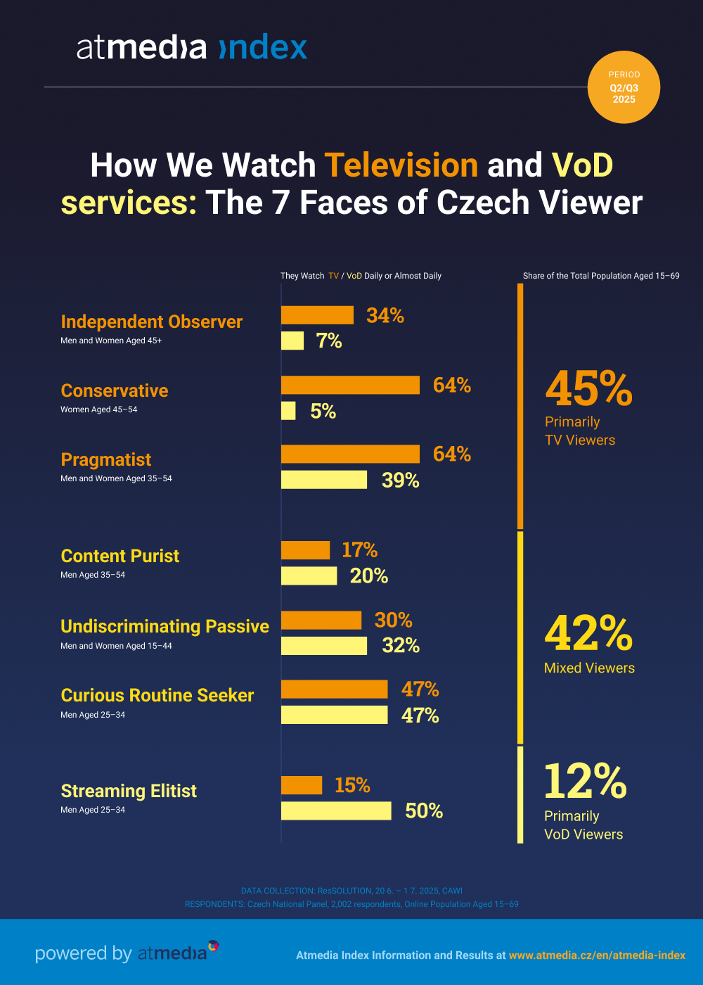 Video content is more abundant than ever before, yet viewers’ time remains just as limited. The latest Atmedia Index research, regularly conducted by the advertising sales house Atmedia, therefore explored how Czechs aged 15–69 combine viewing TV channels and streaming services, how they choose content, and what motivates them. The results revealed that Czech viewers can be divided into seven distinct types and showed that video consumption today is not a matter of choosing one over the other, but rather of smartly combining platforms.