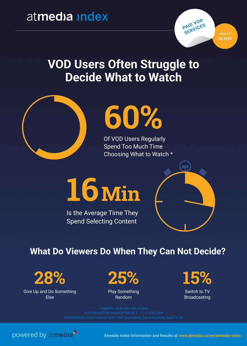 The research for Atmedia, the media representative for thematic television channels, was conducted by the research agency ResSOLUTION using the CAWI method. A total of 2,002 respondents from the Czech National Panel (an online population aged 15–69) participated in the survey. Data collection took place during the period 20th June – 1st July 2025. Atmedia introduced the atmedia index in mid-2021. It provides television channels, media agencies, and other interested parties with comprehensive data, insights, and information in two key areas: (1) the use of paid and free-to-air television, and (2) the use of paid video-on-demand (VOD) services.